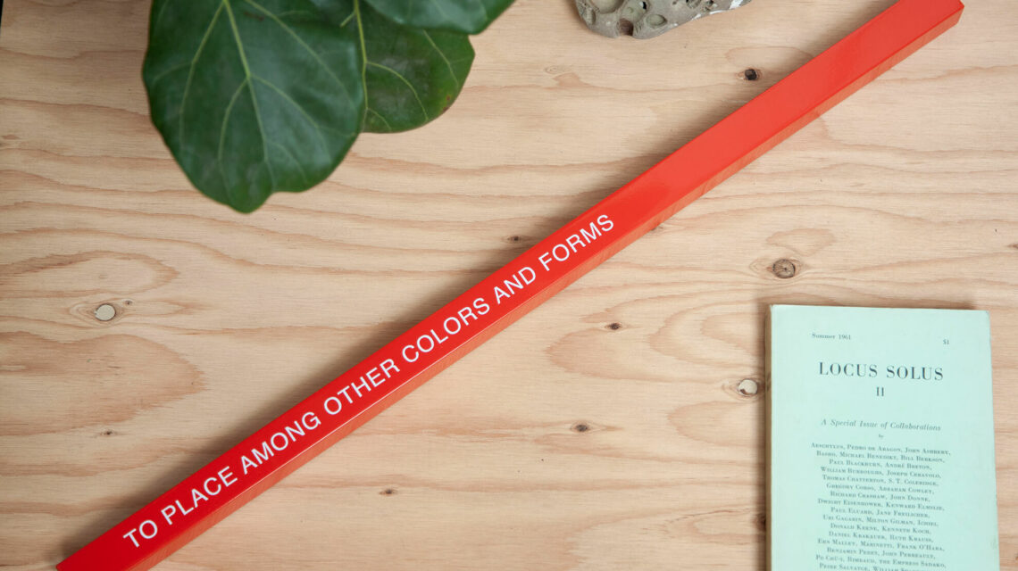 Continue readingA solid aluminum bar, painted a striking red-orange, and bearing the text “TO PLACE AMONG OTHER COLORS AND FORMS.” Limited to a numbered edition of 25 with accompanying edition card, produced and signed by Clark. This is an artwork intended to occupy different areas of your home over time, creating new relational experiences in areas you may have become “blind” to from over-familiarity. This piece asks you to re-see the arrangement it sits with as…