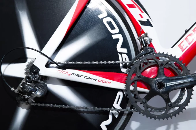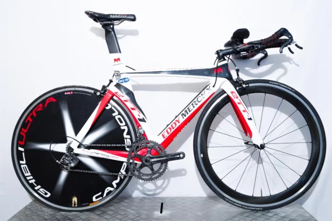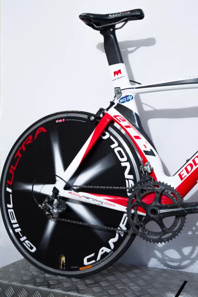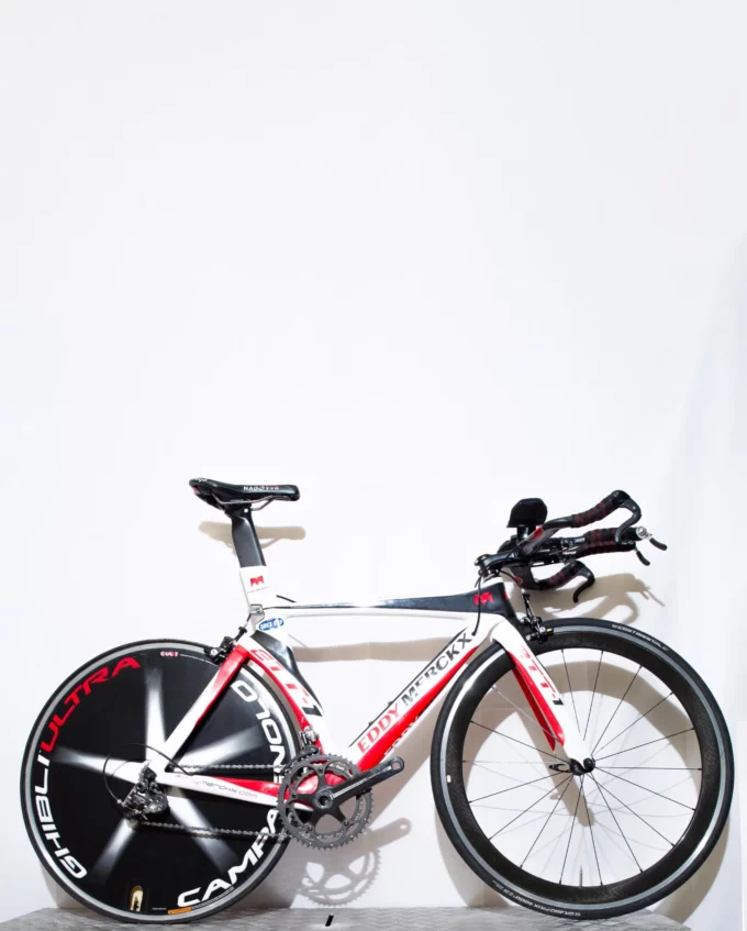 The Eddy Merckx ETT1 was engineered at a time when aerodynamics was beginning to truly reshape bicycle design. Unlike the round-tubed frames of the 1990s, the ETT1 embraced carbon fibre’s potential for sculpted aero profiles, internal cable routing, and integrated geometry optimised for speed against the clock. With its angular silhouette, streamlined carbon seat mast, and aggressive time trial positioning, the ETT1 symbolised a new direction in competitive equipment—sleek, purposeful, and relentlessly fast.