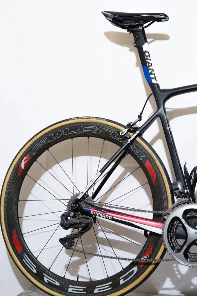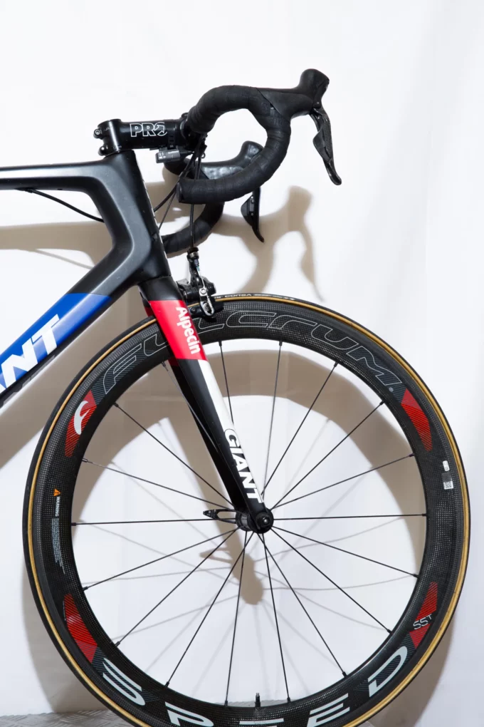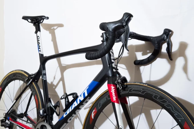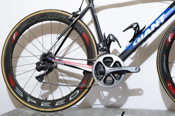 This particular example is fitted with Shimano Dura-Ace 11-speed Di2 electronic shifting, one of the most precise and reliable systems in professional cycling. The instantaneous, accurate gear changes allow riders to maintain optimal cadence and power output, whether attacking in the mountains, launching a breakaway, or responding to sprint trains. Complemented by high-performance Shimano tubular wheels, the setup provides excellent acceleration, stability, and rolling efficiency, ensuring that every watt of power is transferred directly to forward motion.
