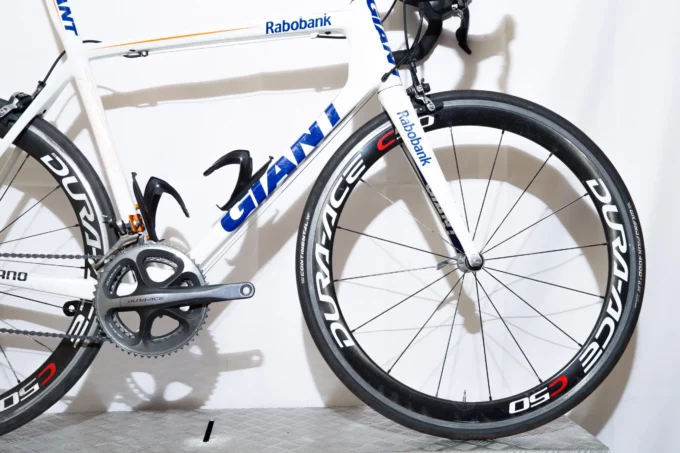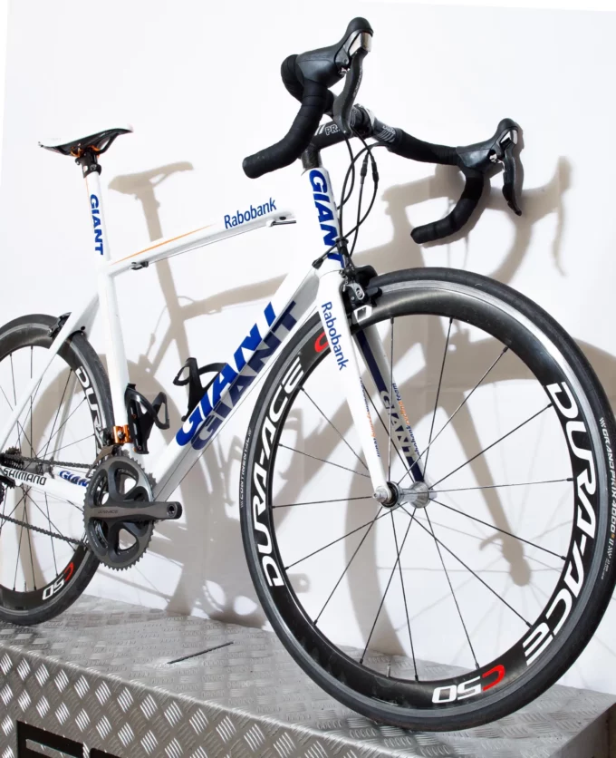 We are delighted to add to our Flandrien Gallery this Giant TCR Advanced SL Team Rabobank bicycle, a rare example of the final generation of mechanical Shimano components used at the professional level. Fitted with Shimano Dura-Ace mechanical groupset and high-performance wheels, this bike remains in immaculate, barely used condition. Unlike many of our other team bikes, this particular frame does not carry a rider’s name sticker, making its history intriguing and mysterious.
