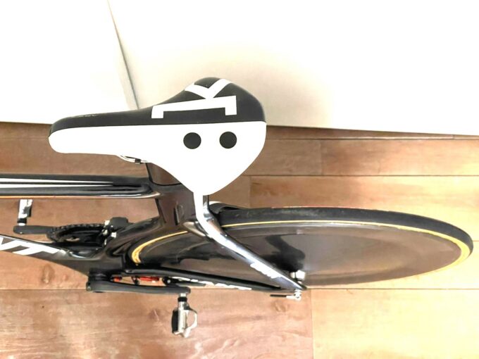 The 2011 Giant Trinity ridden by Robert Gesink for Team Rabobank stands as a testament to cutting-edge cycling technology and the team’s commitment to excellence. This time trial machine was equipped with Shimano Dura-Ace Di2 7970 10-speed electronic shifting, offering precise and reliable gear changes. The frame, sized Large (equivalent to 56cm), was paired with a team-issued disc wheel and a high-profile carbon front wheel featuring a Dura-Ace hub, both shod with tubular tires for optimal aerodynamics and performance.