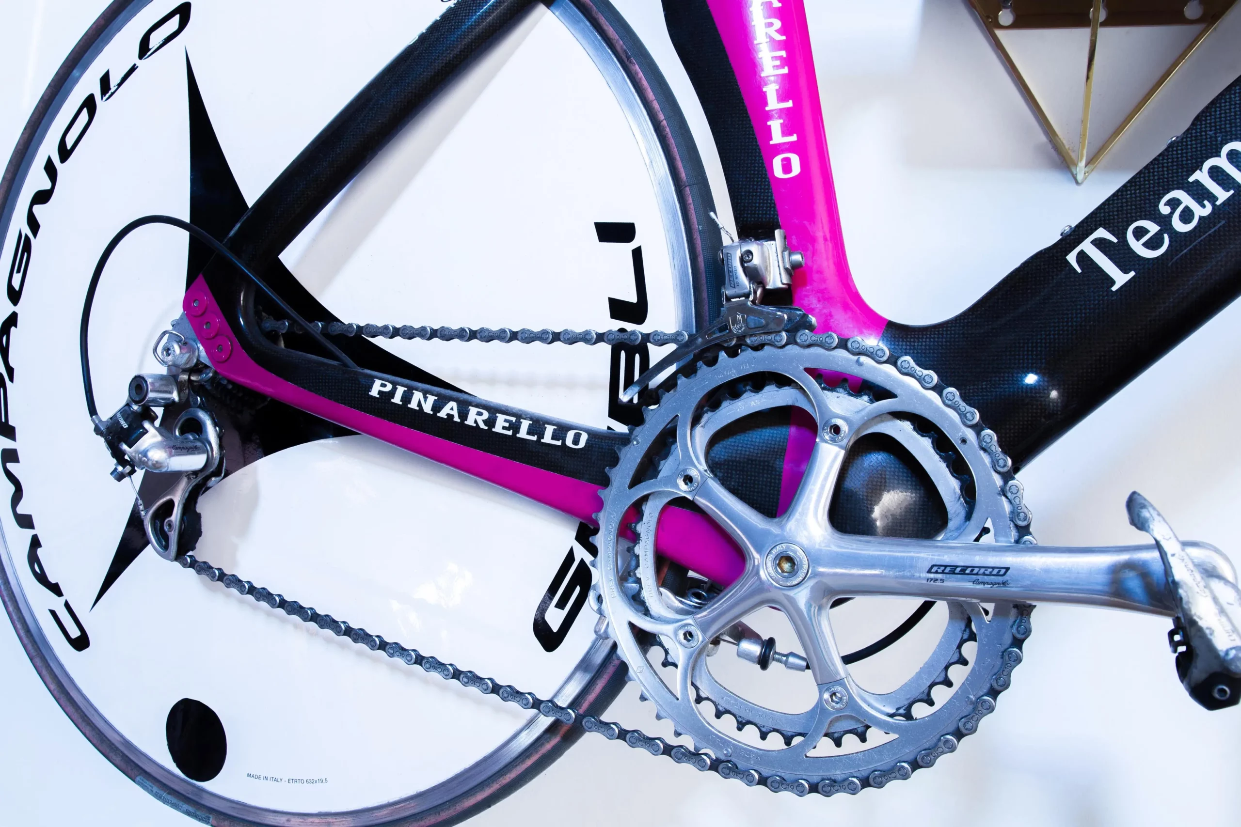 The Pinarello Montello holds a special place in the history of professional cycling, and this original Team Telekom example ridden by Cadel Evans is a rare and remarkable collector’s bicycle. Completely original and built to exact team specifications, it features Campagnolo Record 10-speed components paired with an original Campagnolo Ghibli rear disc wheel and Shamal front wheel, creating a machine that perfectly exemplifies the cutting-edge technology of its era.
