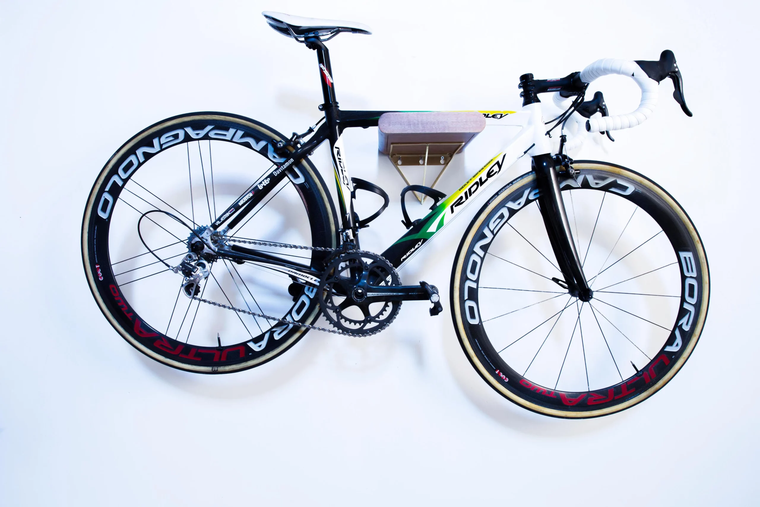From a collector’s perspective, this Ridley Damocles is particularly desirable. Original team bicycles from Davitamon-Lotto, especially those ridden by high-profile sprinters, are exceedingly rare. This example is made even more exceptional by its Australian national champion livery, connecting the machine directly to McEwen’s celebrated status and career achievements. Even with the original fork missing, the combination of carbon frame, Campagnolo Record titanium drivetrain, and historically significant green-and-gold paint scheme makes this bike a compelling addition to any serious collection.