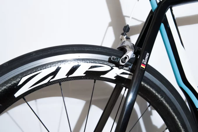 The S-Works Venge frame represents Specialized’s pinnacle of aerodynamic road engineering, designed to maximize speed, stiffness, and handling precision. Its aero-optimized tube shapes and advanced carbon construction allowed Boonen to attack aggressively on cobbled sectors, sprint at high speeds, and dominate classic races. This example features a SRAM Red mechanical groupset, paired with Zipp 404 wheels, providing an ideal balance of stiffness, weight, and aerodynamic efficiency.